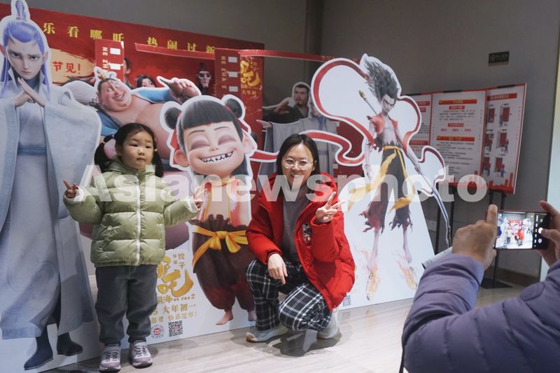 2月17日,在浙江杭州一家影院,观众与电影《哪吒之魔童闹海》人形立板合影。