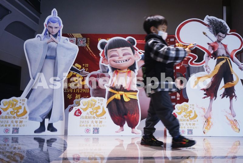 2月17日,在浙江杭州一家影院,观众从电影《哪吒之魔童闹海》人形立板前走过。