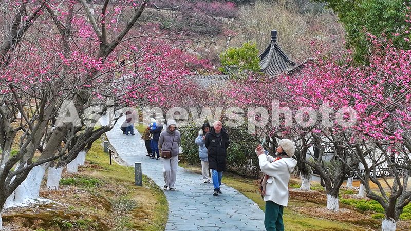 2025年2月20日,游客在江苏省张家港市香山风景区香山梅岭赏梅游玩。早春时节,张家港市香山梅岭300余亩近万株梅花渐次开放,绽放的梅花与园林建筑、山水相映成景,构成了一幅充满生机活力的春日画卷。
