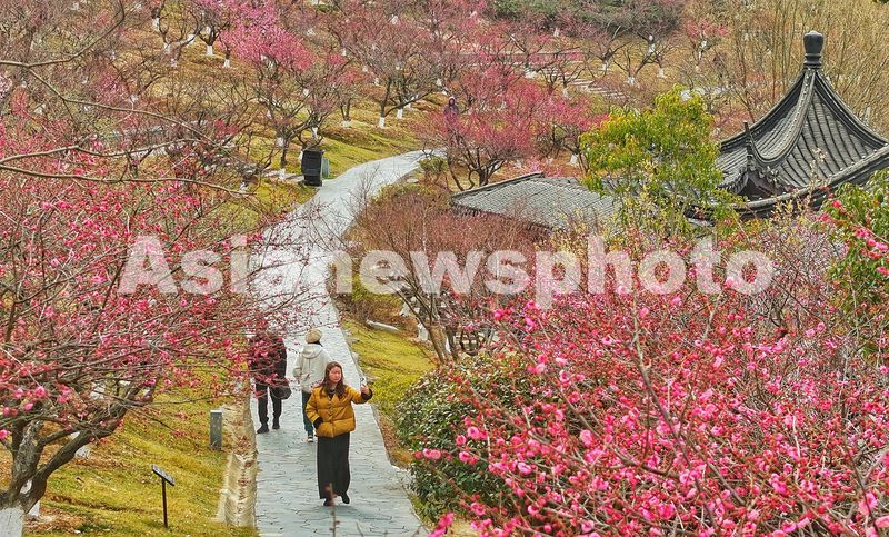 2025年2月20日,游客在江苏省张家港市香山风景区香山梅岭赏梅游玩。早春时节,张家港市香山梅岭300余亩近万株梅花渐次开放,绽放的梅花与园林建筑、山水相映成景,构成了一幅充满生机活力的春日画卷。