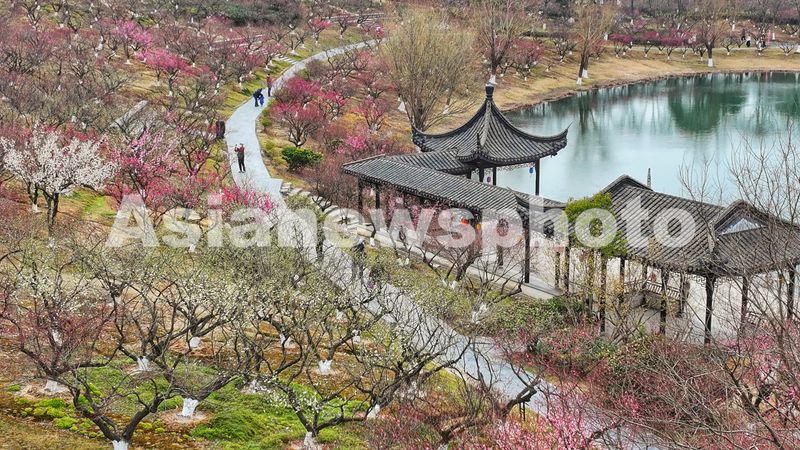 2025年2月20日,游客在江苏省张家港市香山风景区香山梅岭赏梅游玩。早春时节,张家港市香山梅岭300余亩近万株梅花渐次开放,绽放的梅花与园林建筑、山水相映成景,构成了一幅充满生机活力的春日画卷。