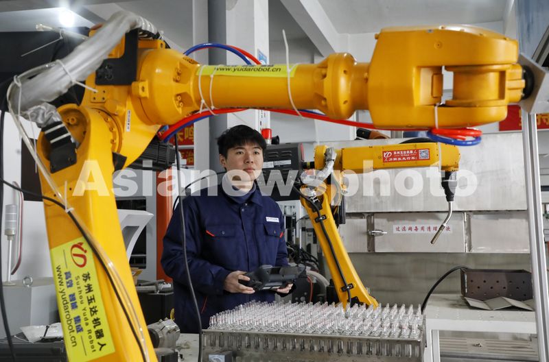 2025年2月21日,位于江苏省张家港市凤凰镇七侠高科创业园内的苏州玉达机器人有限公司,工作人员正在调试工业机器人。