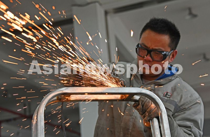 2025年2月21日,在浙江省台州市仙居县经济开发区的浙江自留地车业有限公司生产车间内,工人在打磨加工新能源观光车配件。