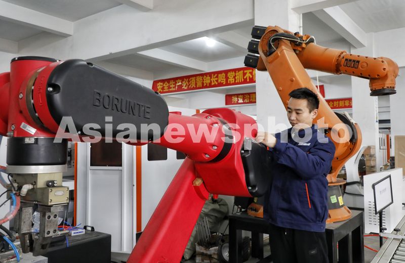 2025年2月21日,位于江苏省张家港市凤凰镇七侠高科创业园内的苏州玉达机器人有限公司,工作人员正在调试工业机器人。