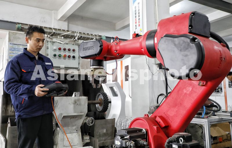 2025年2月21日,位于江苏省张家港市凤凰镇七侠高科创业园内的苏州玉达机器人有限公司,工作人员正在调试工业机器人。
