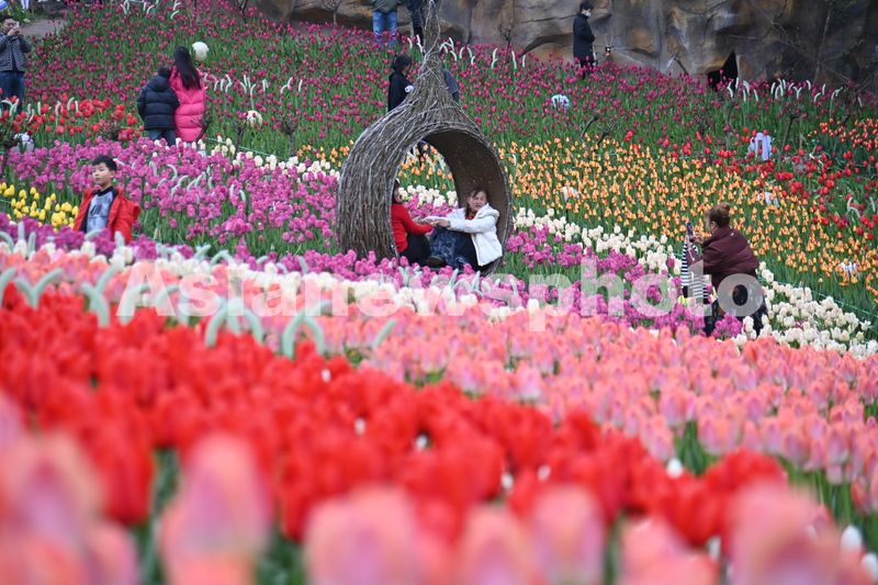 图片说明:2025年2月22日,重庆市沙坪坝区的红岭溪谷景区,游客正在郁金香花海间漫步,乐享美好春光。