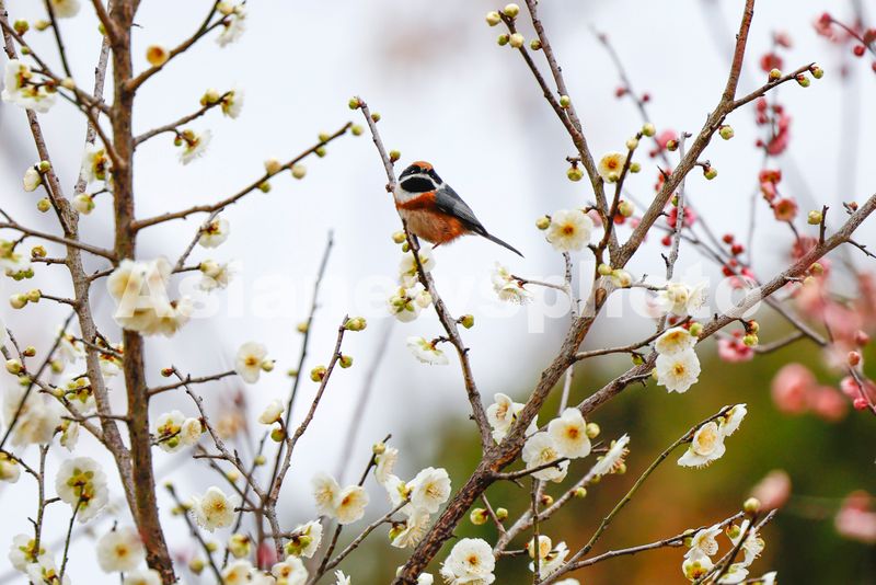 2025年2月21日,安徽省黄山市徽州区千年古村潜口村,鸟儿栖息在梅花枝头。
