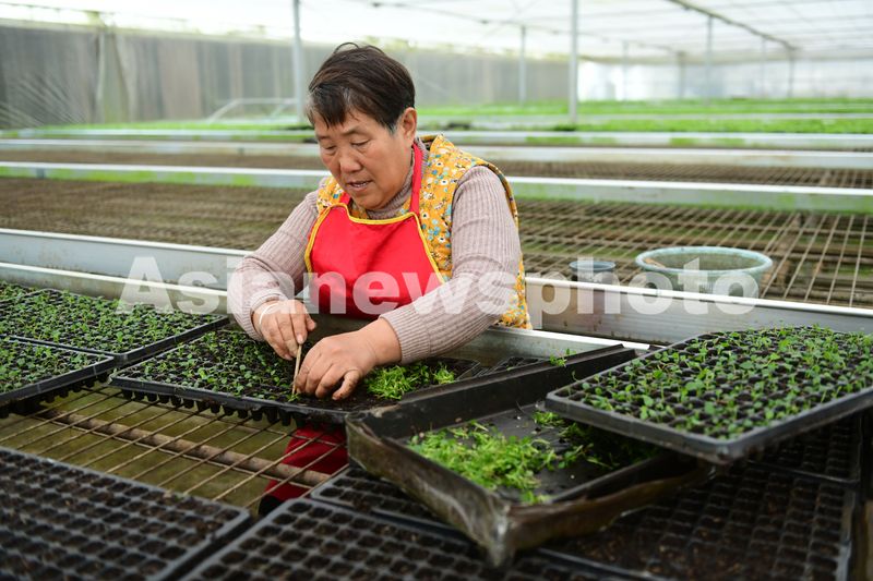 图片说明:2025年2月24日,在位于安徽省阜阳市颍州区王店镇桃花村的安徽农之源生态农业有限公司玻璃温室内,花卉育苗工人移栽花苗。
