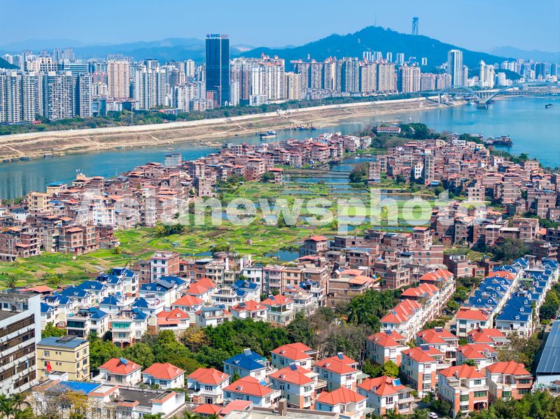 2025年2月24日,广西梧州市长洲区长洲镇,绿色蔬菜生产基地、鱼塘与沿河民居、高楼等构成了一幅美丽的春日城乡新画卷。