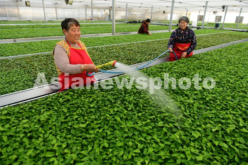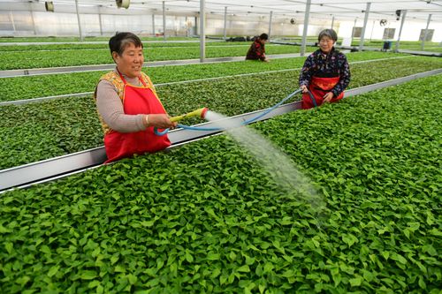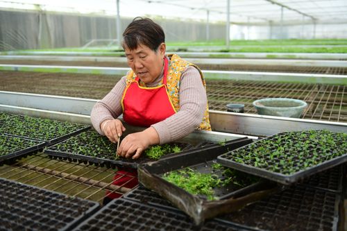 图片说明:2025年2月24日,在位于安徽省阜阳市颍州区王店镇桃花村的安徽农之源生态农业有限公司玻璃温室内,花卉育苗工人对培育的花苗进行水肥管理。