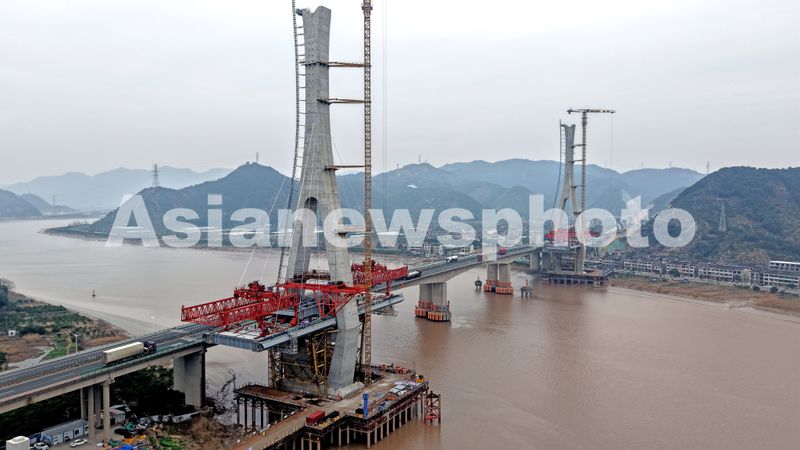 图片说明:2025年2月25日,在G15沈海高速公路浙江省临海市改扩建工程灵江特大桥建设现场,工人正在抓紧施工中。