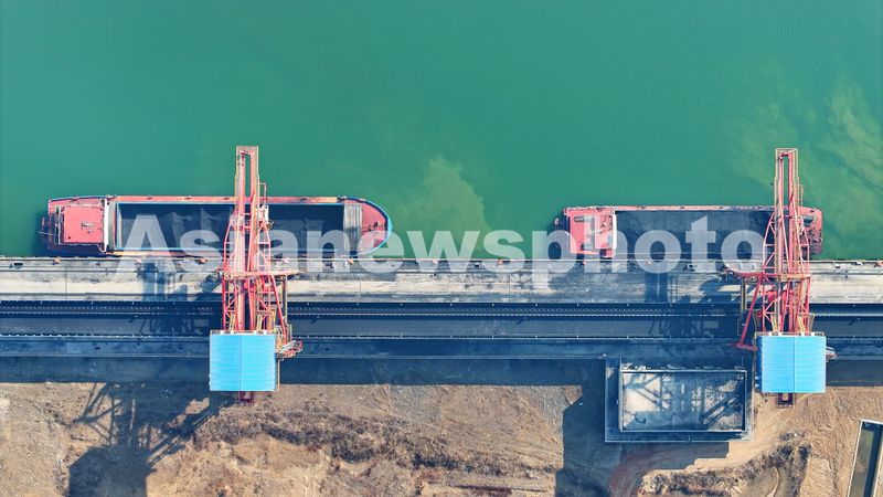 2025年2月27日,江西省宜春市樟树港河西码头,吊机在装卸煤炭、玉米粒、化肥等物资,保障企业生产和春耕备耕物资供应。