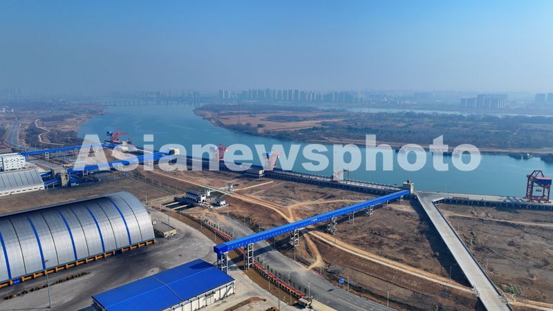 2025年2月27日,江西省宜春市樟树港河西码头,吊机在装卸煤炭、玉米粒、化肥等物资,保障企业生产和春耕备耕物资供应。