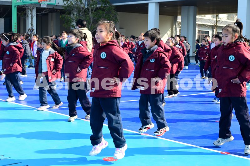 图片说明:2025年2月28日,在浙江省金华市环城小学教育集团长湖湾校区的特色大课间,学生们在操场上开合跳。