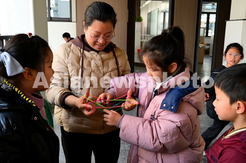图片说明:2025年2月28日,在浙江省金华市环城小学教育集团长湖湾校区的特色大课间,师生们在教室走廊上开展翻花绳游戏。