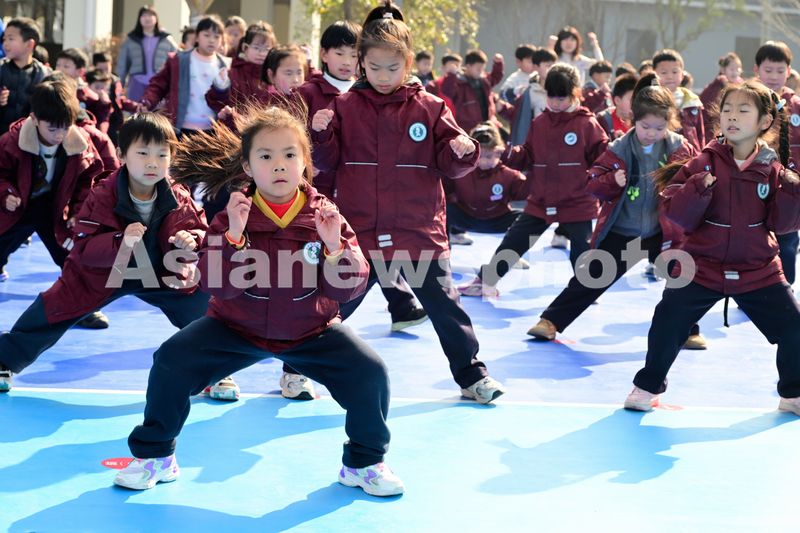 图片说明:2025年2月28日,在浙江省金华市环城小学教育集团长湖湾校区的特色大课间,学生们在操场上左右深蹲。