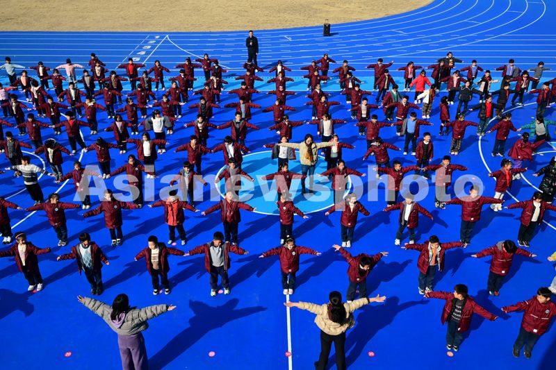 图片说明:2025年2月28日,在浙江省金华市环城小学教育集团长湖湾校区的特色大课间,学生们在操场上开展上下左右拉伸。