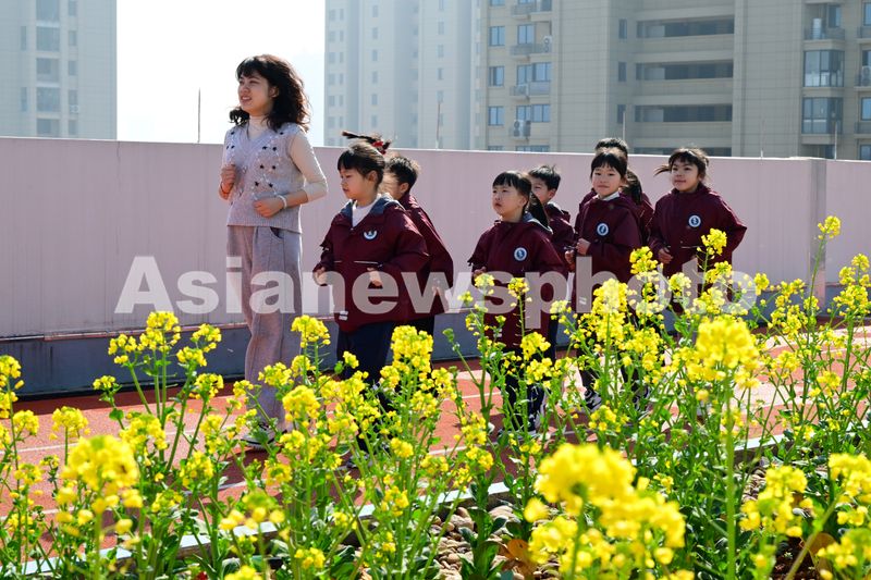 图片说明:2025年2月28日,在浙江省金华市环城小学教育集团长湖湾校区的特色大课间,师生们在空中平台上集体跑操。