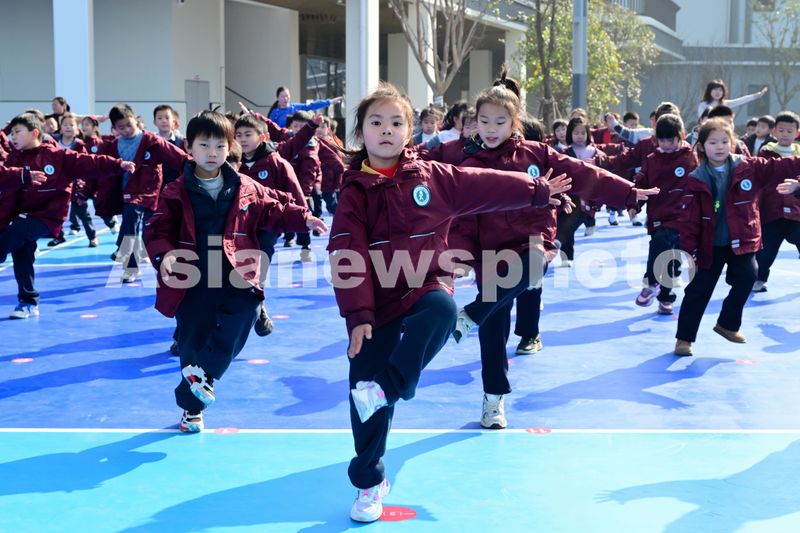 图片说明:2025年2月28日,在浙江省金华市环城小学教育集团长湖湾校区的特色大课间,学生们在操场上胯下击掌。