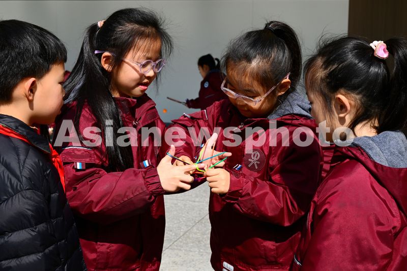 图片说明:2025年2月28日,在浙江省金华市环城小学教育集团长湖湾校区的特色大课间,学生们在教室走廊上开展翻花绳游戏。