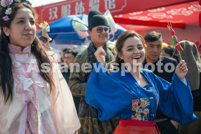 2025年3月1日,在安徽省芜湖市湾沚区花桥镇举办的省级非遗九十殿庙会上,外国留学生在参加汉服巡游活动。