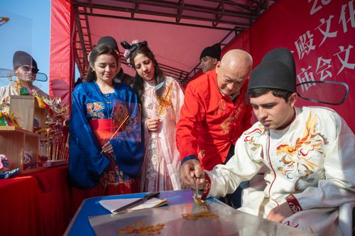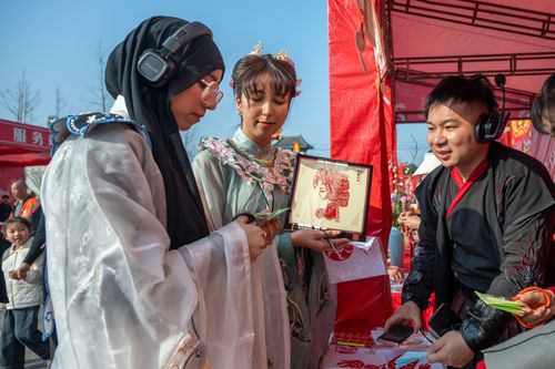 2025年3月1日,在安徽省芜湖市湾沚区花桥镇举办的省级非遗九十殿庙会上,身穿汉服的外国留学生体验剪纸、做糖画等非遗项目,沉浸式感受中国传统文化的魅力。