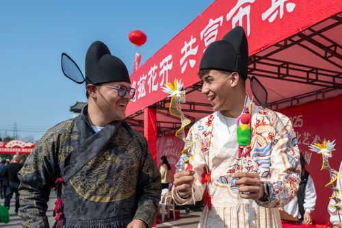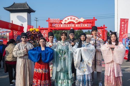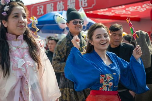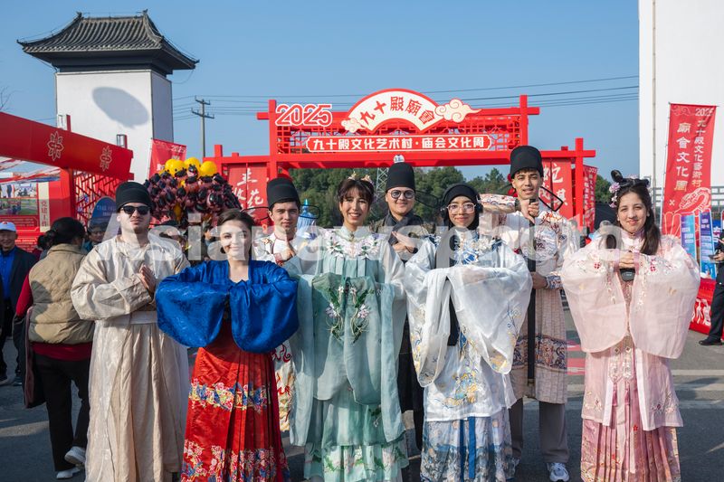 2025年3月1日,在安徽省芜湖市湾沚区花桥镇举办的省级非遗九十殿庙会上,身穿汉服的外国留学生在拍照留念。