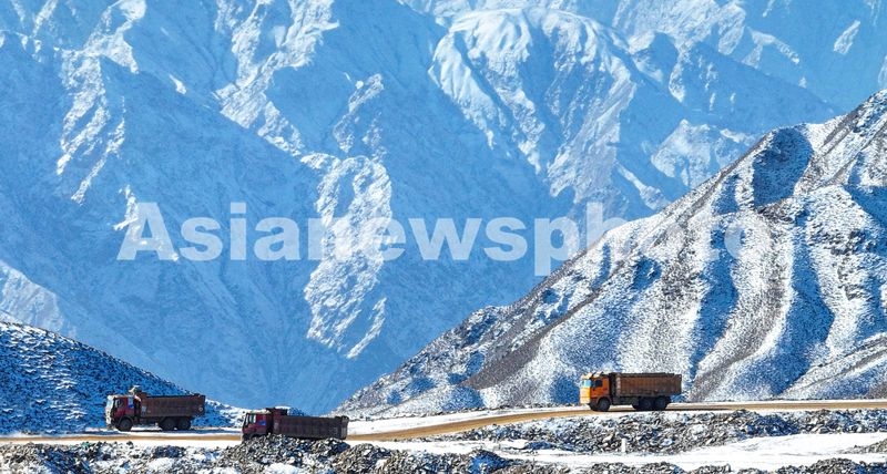 图片说明:2025年3月3日,位于祁连山北麓、黑河出山口左岸的张掖盘道山山顶上五边型上水库建设工地上,拉运土石方的重型卡车来回穿梭。