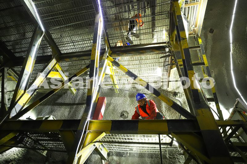 图片说明:2025年3月3日,位于祁连山北麓、黑河出山口左岸的张掖盘道山山顶一号施工洞内工程建设者们正在进行钻架整理。