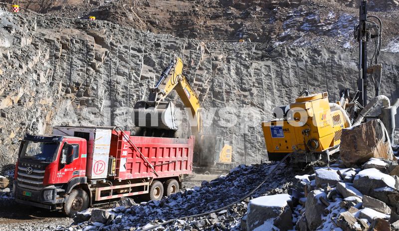 图片说明:2025年3月3日,位于祁连山北麓、黑河出山口左岸的张掖盘道山山顶上五边型上水库建设工地上,挖掘机正在挖掘土石方。