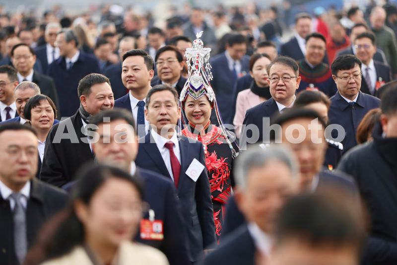 图片说明:开幕会前,全国人大代表步入会场。