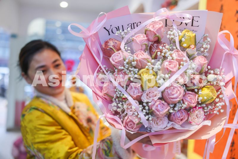 2025年3月5日,安徽省淮北市濉溪县花馍非遗传承人赶制以“玫瑰花”为主题的花馍喜迎三八妇女节,惟妙惟肖的“玫瑰花”受到消费者喜爱。