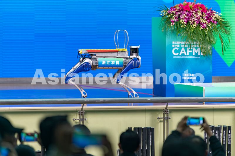 2025年3月6日,一款标注“浙江农机”机器人在浙江省金华市永康国际会展中心亮相,吸引现场观众好奇的目光。