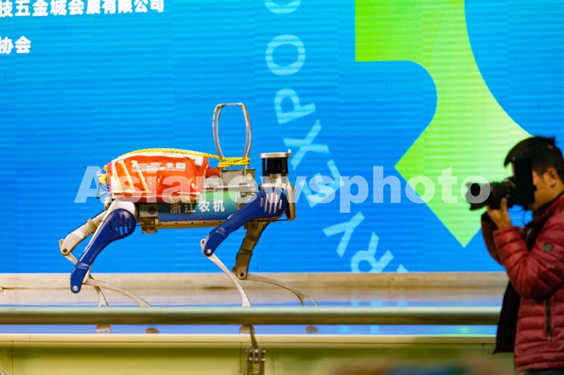 2025年3月6日,一款标注“浙江农机”机器人背着农资产品在浙江省金华市永康国际会展中心亮相,吸引现场观众好奇的目光。