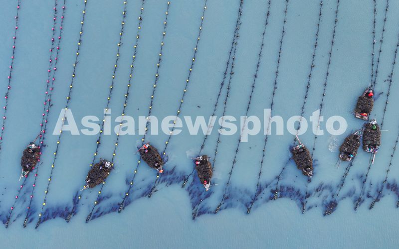 图片说明:2025年3月7日,山东省荣成市爱伦湾海洋牧场海带养殖区,渔民在采收海带。