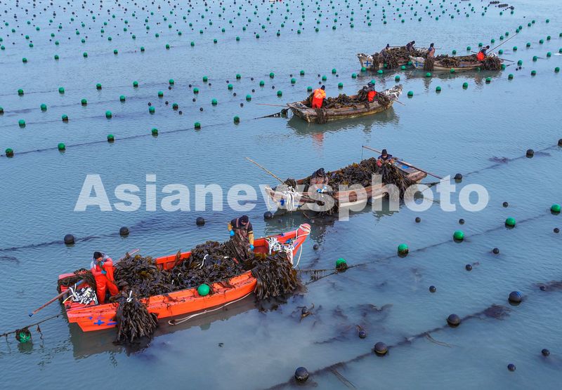 图片说明:2025年3月7日,山东省荣成市爱伦湾海洋牧场海带养殖区,渔民在采收海带。