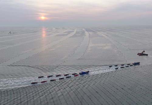 山东荣成:渔民迎着朝阳收获海带 查看组图