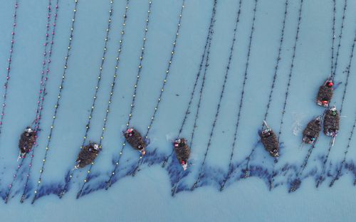 图片说明:2025年3月7日,山东省荣成市爱伦湾海洋牧场海带养殖区,渔民在采收海带。