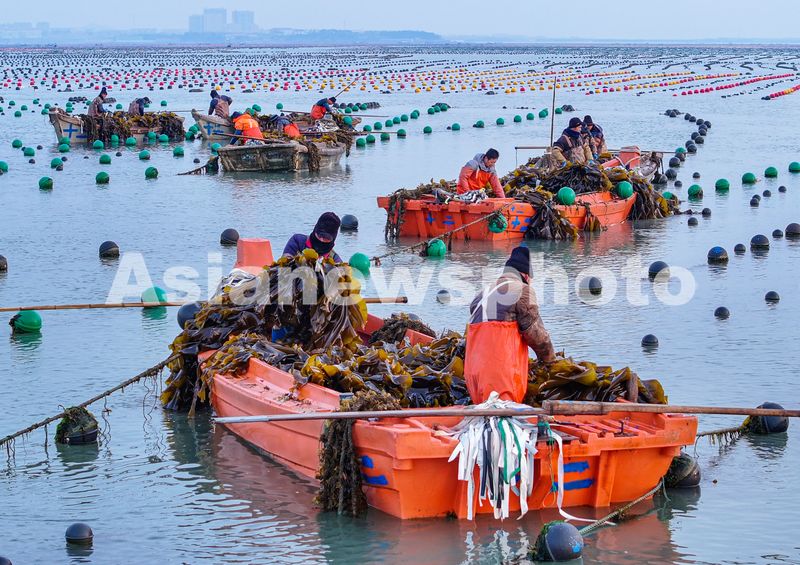图片说明:2025年3月7日,山东省荣成市爱伦湾海洋牧场海带养殖区,渔民在采收海带。