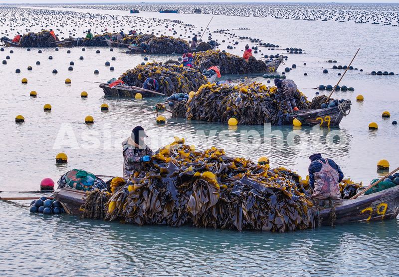 图片说明:2025年3月7日,山东省荣成市爱伦湾海洋牧场海带养殖区,渔民在采收海带。