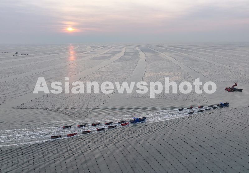 山东荣成:渔民迎着朝阳收获海带 查看组图