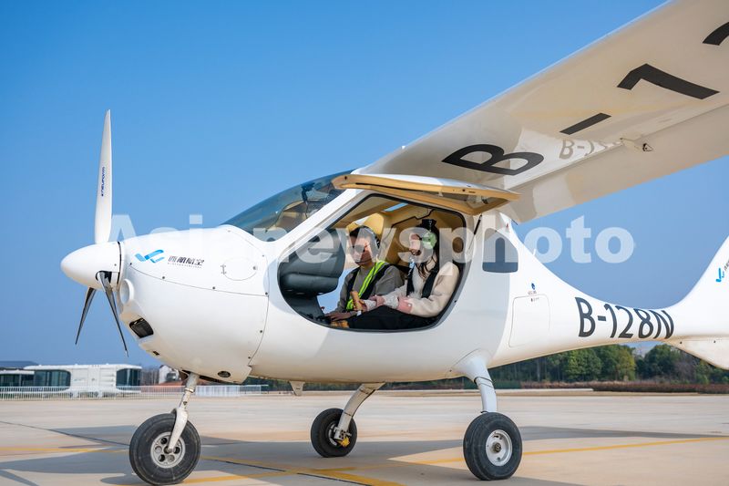 2025年3月8日,在安徽省芜湖市湾沚区花桥镇东方飞谷航空飞行营地,游客乘坐小型固定翼飞机体验飞行乐趣。