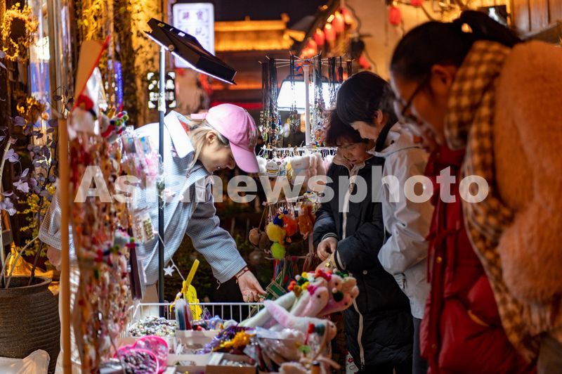 2025年3月8日晚,浙江省金华市,游客在武义古城夜市里休闲购物游玩。
