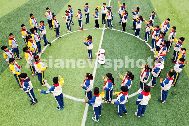 图片说明:2025年3月10日,在江苏省如皋经济技术开发区实验小学课间,智能机器人“宾果”与学生一起跳舞。