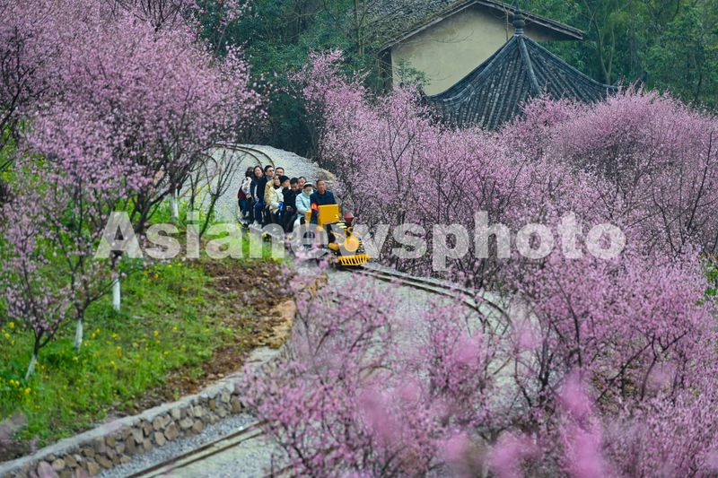 图片说明:2025年3月9日,重庆市沙坪坝区的红岭溪谷景区,游客乘坐景区的“小火车”畅游花海,乐享美好春光。