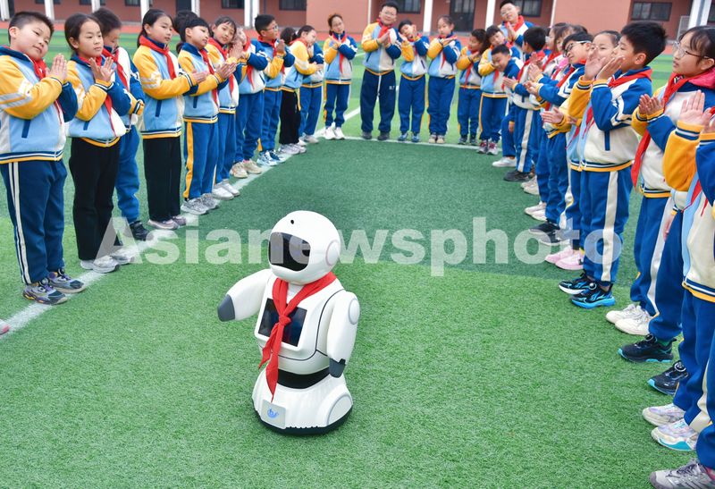 图片说明:2025年3月10日,在江苏省如皋经济技术开发区实验小学课间,智能机器人“宾果”指挥学生唱歌。