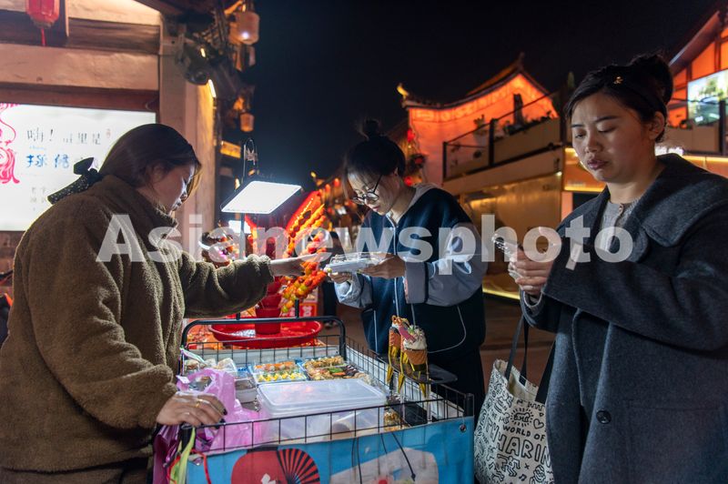 2025年3月8日晚,浙江省金华市,游客在武义古城夜市里休闲购物游玩。