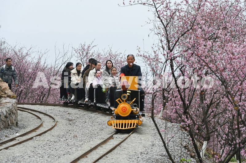 图片说明:2025年3月9日,重庆市沙坪坝区的红岭溪谷景区,游客乘坐景区的“小火车”畅游花海,乐享美好春光。