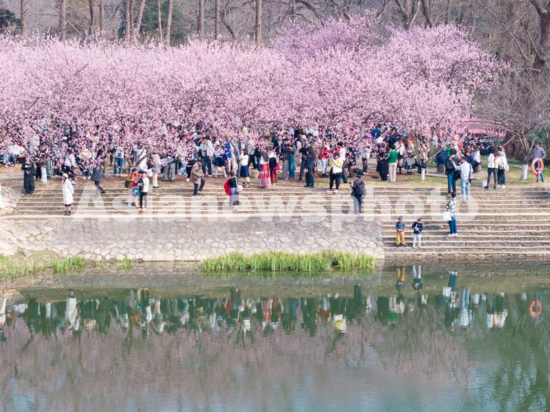 图片说明:2025年3月8日,游客在南京中山植物园赏樱游玩。