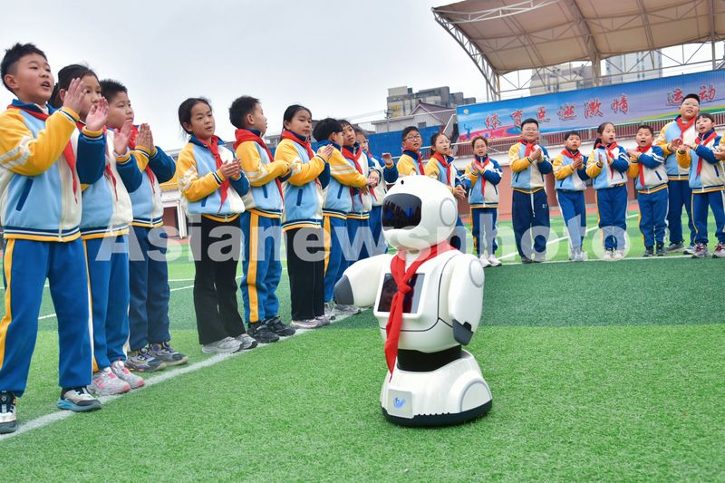 图片说明:2025年3月10日,在江苏省如皋经济技术开发区实验小学课间,智能机器人“宾果”指挥学生唱歌。